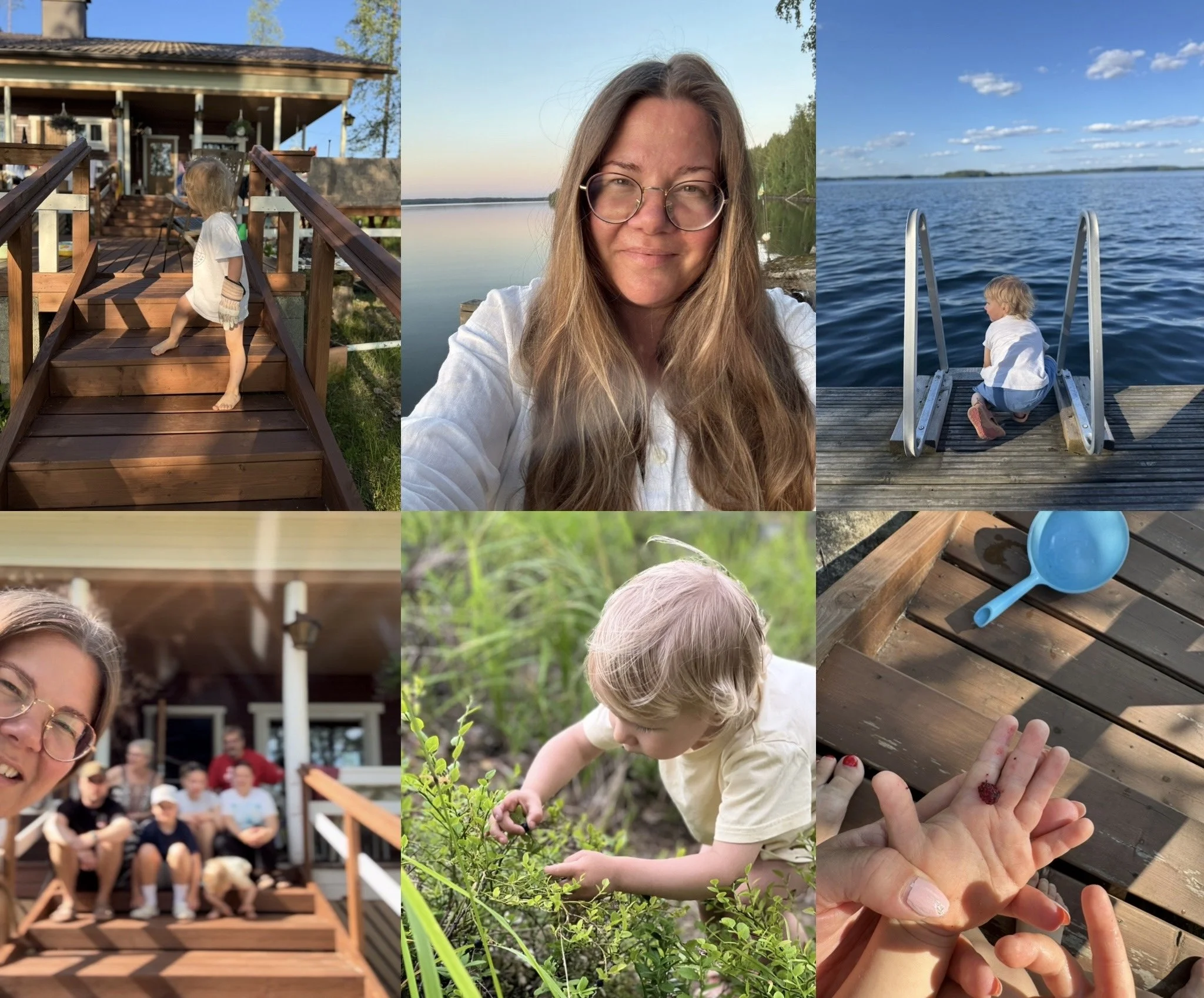 Mutta itse mökillä oli IHANAA. Oli lämmintä ja kaunista ja lapsi eli aivan parasta elämäänsä. Mukana oli myös mun sisko perheineen, joten lapsella oli paljon seuraa. Suosikiksi nousi siskoni puoliso, joka teki mökillä jotain nikkarointihommia ja otti lapsen mukaan. Siitä lähtien lapsi on ollut sitä mieltä että jokaisen maailman ruuvin on ruuvannut Pasi – enkä minä korjannut häntä (mistäs minä tiedän kuka ne on ruuvaillut?). Alettiin harjoitella vaipattomuutta (lapsen, ei Pasin kanssa), joka oli tosi helppoa, kun mökillä pystyi olemaan koko ajan ilman housuja. Lapsi kävi uimassa monta kertaa, touhusi aikuisten kanssa, leikki siskon lasten kanssa ja oli kertakaikkisen onnesta soikeana koko ajan. Se teki niistä hirveistä matkoistakin (lähes) sen arvoisia.