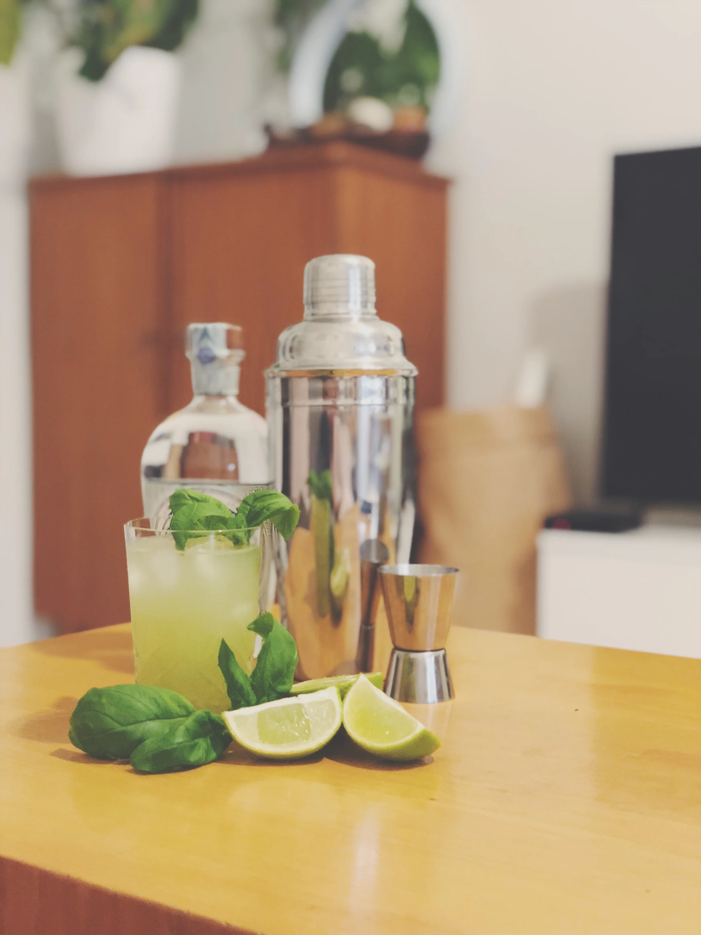Cocktail on helppo tehdä: ainekset shakeriin ja shaky-shaky-shake. Basilikaa ei ole välttämätöntä runnoa shakerissa pilalle, mutta se antaa juomalle kauniin, vihreän värin, varsinkin, jos sen murskaa muddlerilla shakerin pohjalle. Olen kuitenkin oppinut ihka oikealta baarimikolta, että basilikan maku muuttuu liikaa rytyyttäessä kitkeräksi, joten roippeita ei juomaan ainakaan kannata laittaa.