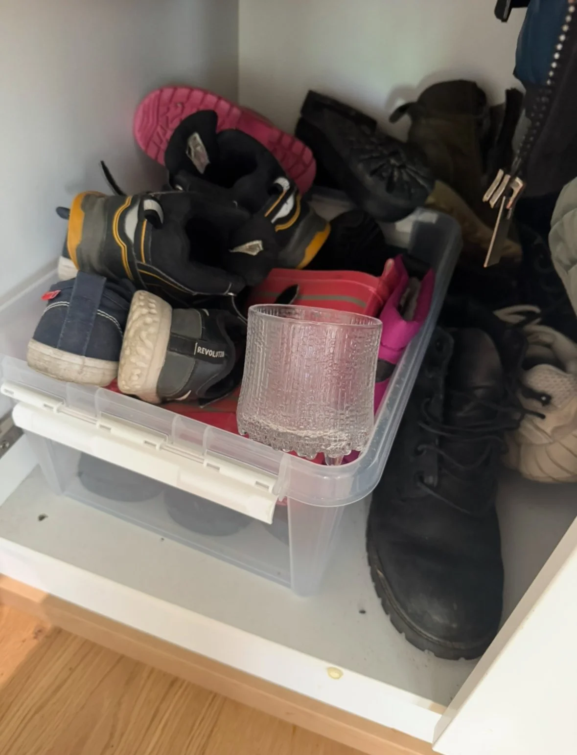 Yhtenä päivänä löysin kenkäkaapista grogilasin, enkä tiedä oliko se joutunut sinne minun vai taaperon toimien seurauksena.